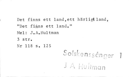 //// Det finns ett land,ett härligtland, //// "Det fifins ett land. //// Mel: J.A.Hultman //// 3 str. //// Nr 118 s. 125 //// So'skenssånner 1 ////