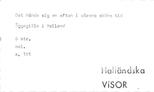 //// Det hände sig en afton i vårens sköna tid Äggagille i Halland //// II 6 str. //// mel. //// s. 181 //// Halländska //// ViSOR ////