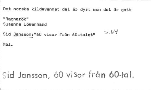 //// Det norska kildevannet det är dyrt men det är gott //// "Ragnarök" //// Susanne Löwenhard //// Sid Jansson:"60 visor från 60-talet" s, 4,11 //// Mel. //// Id Jansson, 60 visor från 60-tal. ////