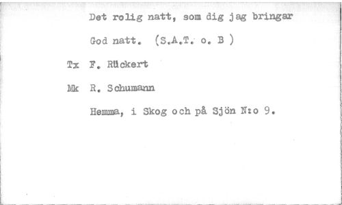 //// Det rolig natt, som dig jag bringar //// God natt. (S.A.T. o. B ) //// Ta F. Rtickert //// Nk R. Schumann //// Hemma, i Skog och på Sjön N:o 9 ////