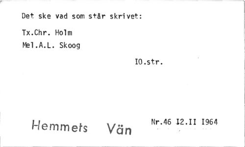 //// Det ske vad som står skrivet: //// Tx.Chr. Holm Mel.A.L. Skoog //// IO.str. //// 1-1emmets Vön Nr.46 12.11 1964 ////