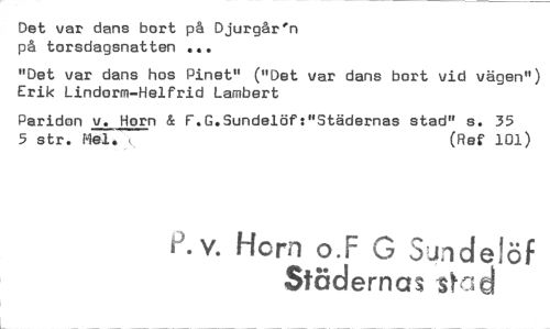 //// Det var dans bort på Djurgår'n på torsdagsnatten .4. //// "Det var dans hos Pinat" ("Det var dans bort vid vägen") Erik Lindorm-Helfrid Lambert //// Paridon v. Horn & F.G.Sundelöf:"Städernas stad" s. 35 //// 5 str. Mel. ( (Ref 101) //// r).v. Horn o.F G Sundelöf //// Städernas stad ////