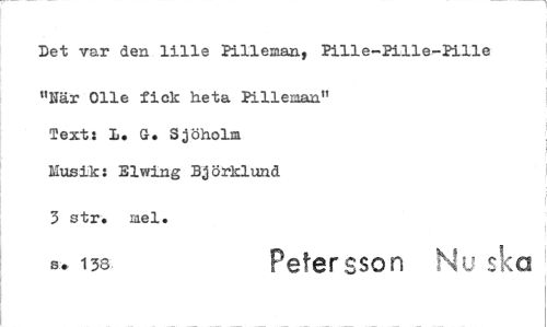 //// Det var den lille Pillerna% Pille-Pille-Pille //// "När 011e fick heta Pilleran" Text: 1. G. Sjöholm //// Musik: Elwing Björklund //// 3 str. rael. //// e. 138 Peter sso n s ska ////