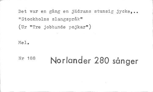 //// Det var en gång en jädrans stunsig jycke,.. "Stockholms slangspråk" (Ur "Tre jobbande pojkar") //// Nr 188 Norlander 280 sånger ////