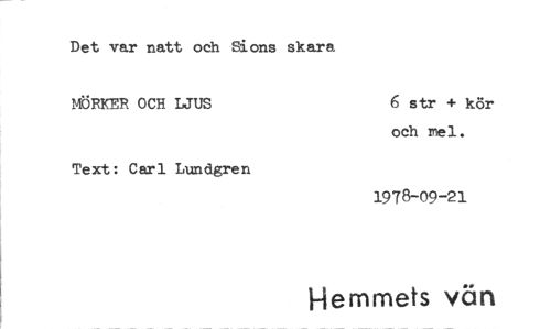 //// Det var natt och Sions skara MÖRKER OCH LJUS //// Text: Carl Lundgren //// 6 str + kör och mel. //// 1978-09-21 //// Hemmets vän ////