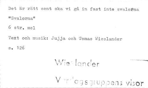 //// Det är rätt sent ska vi gå in fast inte svalo2na //// "Svalorna" //// 6 str. mel //// Text och musik: Jujja och Tomas Wieslander //// s. 126 //// lander //// X35111;: ens visor ////