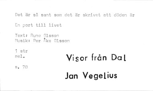 //// Det är så sant som det är skrivet att döden är En port till livet //// Text: Rune Olsson //// Musik: Per Åke Olsson //// 1 str //// mel. Visor från Dal //// s. 70 //// Jan Vegelius ////
