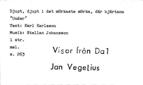 //// Djupt, djupt i det mörkaste mörka, där hjärtana //// "Under" //// Text: Karl Karlsson //// Musik: Stellan Johansson //// 1 str. //// mel. //// Visor tran Da l //// s. 263 (4- //// Jan Vegeljus ////