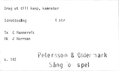 //// Drag ut till kamp, kamrater //// Idrottssäng 4 str //// Tx C Mannervik Mk J Norrman //// s. 142 Petersson & Cider -:park Sång o s pet ////