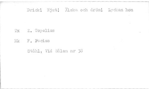 //// Drick! Njut! Älska och dröm1 Lyckan hon //// 2x Z. Topelius Tik F. Pacius //// stethl, Vid Bålen nr 33 ////