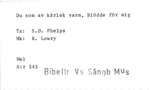 //// Du som av kärlek varm, Blödde för mig //// Tx: S.D. Phelps Mk: R. Lowry //// Mel //// N:r 545 //// Bibeftr Vs Sånqb Mus ////