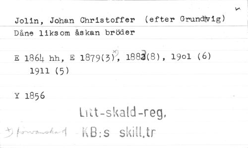 //// Jolin, Johan Christoffer (efter Grundavig) Dåne liksom åskan bröder //// E 1864 hh, E 1879(3), 188ä(8), 1901 (6) 1911 (5) //// Y 1856 //// KB:s skitUr ////