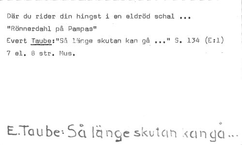 //// Där du rider din hingst i en eldröd schal ... "Rönnerdahl på Pampas" //// Evert Taube:"Så länge skutan kan gå ..." S. 134 (E:1) 7 el. 8 str. Mus. //// E. To u be sa. rå nge skutcn an - ////