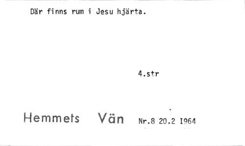//// Där finns rum i Jesu hjärta. //// 4.str //// Hemmets Vän Nr.8 20.2 1964 ////