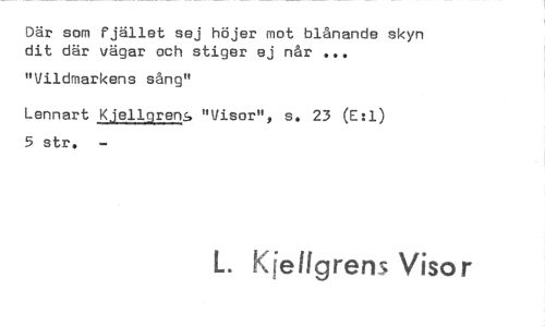 //// Där som fjället sej höjer mot blånande skyn dit där vägar och stiger ej når //// "Vildmarkens sång" //// Lennart Kjellgrens "Visor", s. 23 (E:1) 5 str. //// L. Kfellgrens Visor ////