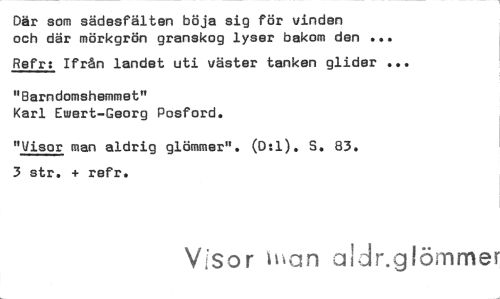//// Där som sädesfälten böja sig för vinden och där mörkgrön granskog lyser bakom den ... //// Refr: Ifrån landet uti väster tanken glider ... //// "Barndomshemmet" //// Karl Ewert-Georg Posford. //// "Visor man aldrig glömmer". (0:1). S. 83. 3 str. + refr. //// Visor ihan aldr.glömrner ////