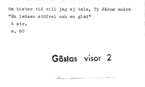 //// Om bister tid vill jag ej tala, Ty därom andra "En ledsen stöfvel och en glad" //// 6 str. //// s. 80 //// Göstas visor 2 ////