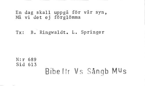 //// En dag skall uppgå för vår syn, Må vi det ej förglömma //// Tx: B. Ringwaldt. L. Springer //// N:r 689 //// Sid 613 //// Bibe Pr s Sångb Mus ////