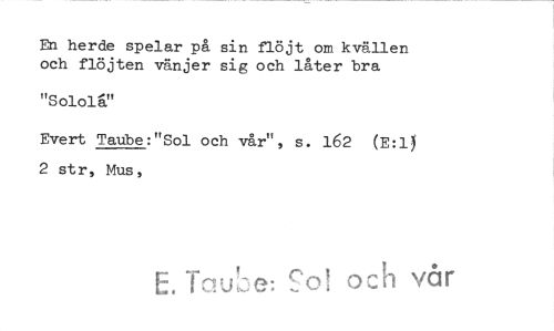 //// En herde spelar på sin flöjt om kvällen och flöjten vänjer sig och låter bra //// "Sololä" //// Evert Taube:"Sol och vår", s. 162 (E:11 2 str, Mus, //// E. Tou::,e: Sfo! och vår ////