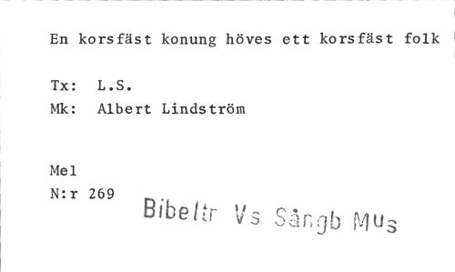 //// En korsfäst konung höves ett korsfäst folk //// Tx: L.S. //// Mk: Albert Lindström //// Mel //// N:r 269 Bibetts Vs Sångb Mus ////