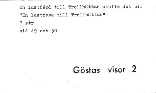 //// En lustfärd till Trollhättan skulle det bli "En lustresa till Trollhättan" //// 7 str //// sid 49 och 50 //// Göstas visor 2 ////