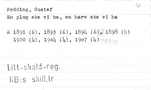 //// Fröding, Gustaf //// En plog ska vi ha, en harv ska vi ha //// E 1891 (6), 1893 (6), 1894 (6)( 1898 (4) //// 1900 (4)9 1904 (4), 1907 (4) //// Lift-skald-reg, //// KB skill.tr ////
