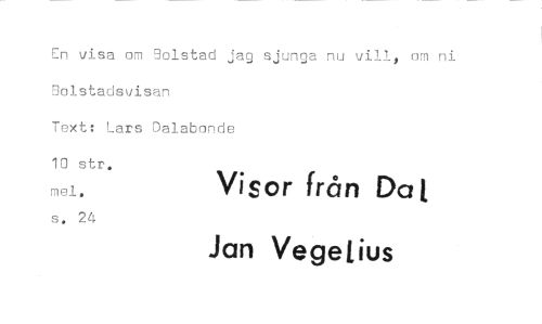 //// En visa om Solstad jag sjunga nu vill, om ni Bolstadsvisan //// Text: Lars Dalabonde //// 10 str. mel. Visor från Da I //// s. 24 Jan Vegejius ////
