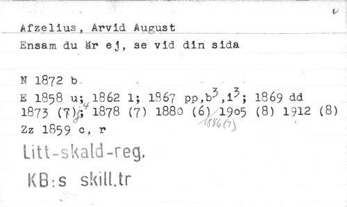 //// tJ I //// Afzelius, Arvid August //// Ensam du är ej, se vid din sida N 1872 b //// E 1858 u; 1862 1; 1367 pp,b3,13; 1869 dd //// 1873 (7)591878 (7) 1880 090145 (8) 1912 (8) //// Zz 1859 c, r //// titt-skald-reg, //// KB:s skilUr ////