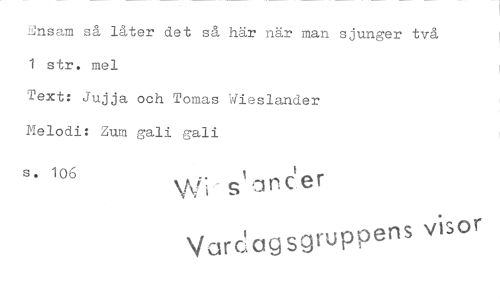 //// Ensam så låter det så hår när man sjunger två 1 str. mel //// Text: Jujja och Tomas Wieslander //// Melodi: Zum gall gall //// s. 106 Wi- s'anc'.er //// Vardagsgruppens vis®r ////