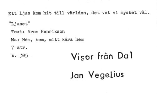 //// Ett ljus kom hit till världen, det vet vi mycket väl. //// "Ljuset" //// Text: Aron Henrikson //// Ma: Hem, hem, mitt kära hem 7 str. //// s. 325 Visor från Dal //// Jan Vegelius ////
