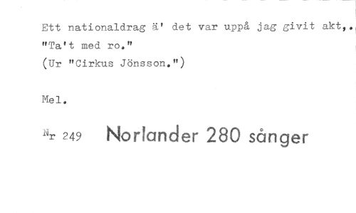 //// Ett nationaldrag ä' det var uppå jag givit akt,., "Ta't med ro." //// (Ur "Cirkus Jönsson.") //// Mel. //// imr 249 Norlander 280 sånger ////
