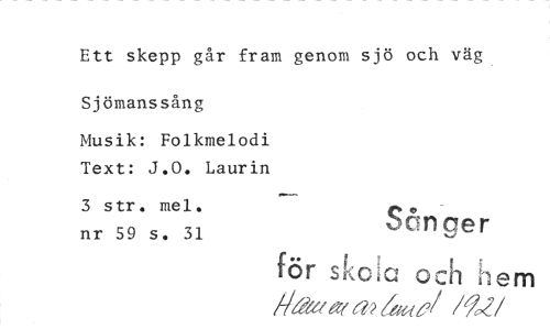 //// Ett skepp går fram genom sjö och väg Sjömanssång //// Musik: Folkmelodi //// Text: J.O. Laurin //// 3 str. mel. Sen ger //// nr 59 s. 31 för skola och hem //// l/ke( a? bt(r0/ /V //// /