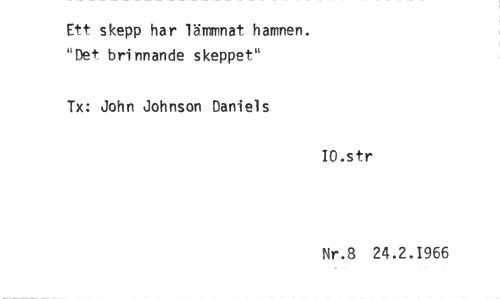 //// Ett skepp har lämmnat hamnen. "Det brinnande skeppet" //// Tx: John Johnson Daniels //// IO.str //// Nr.8 24.2.1966 ////