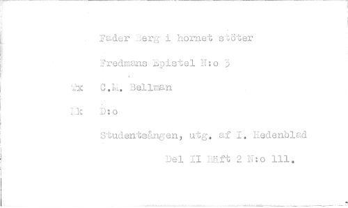 //// Fader 2erg i hornet stöter //// Fredmans Epistel N:o 3 //// 2x C.M. 'Bellman //// L:k D:o //// Studentsången, utg. af 1. Hedenblad Del II Höft 2 N:o 111. ////