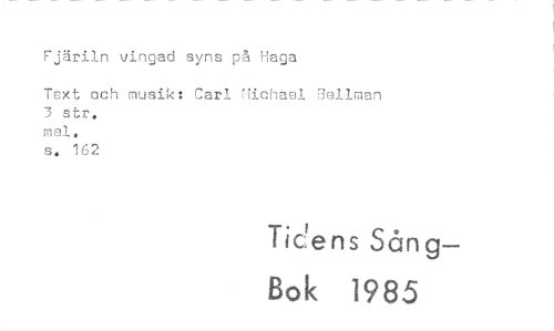 //// Fjäriln vingad syns på Haga //// Text och musik: Carl Michael 3ellman 3 str. //// mel. //// s. 162 //// Tidens Sång- //// Bok 1985 ////