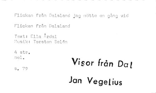 //// Flickan från Dalsland jag mötte en gång vid Flickan från Dalsland //// Text: Ella yrdal Musik: Torsten Selån //// 4 str. mel. Visor från Dal //// s. 79 Jan VegeLius ////