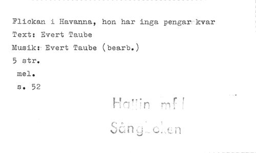 //// Flickan i Havanna, hon har inga pengar kvar Text: Evert Taube //// Musik: Evert Taube (bearb.) //// 5 str. //// mel. //// s. 52 //// H 17: 7 7r //// ri. i //// 1/4A //// n //// , f n ////
