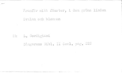 //// 2famför mitt fönster, i den gröna linden Svalan och bloman //// Lk L. Gordigiani //// nngarens Bibi. II Saml. pag. 222 ////