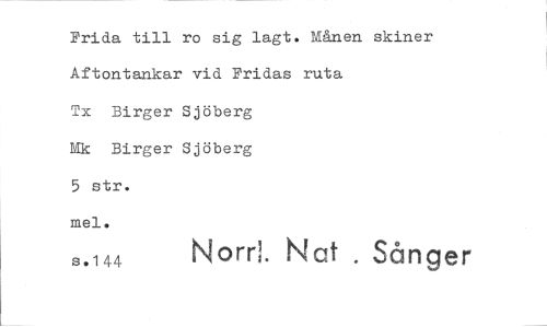 //// Frida till ro sig lagt. Månen skiner Aftontankar vid Fridas ruta //// Tx Birger Sjöberg Mk Birger Sjöberg 5 str. //// mel. //// s.144 Nord. Not . Sånger ////