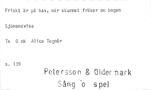 //// Friskt är på hav, när skummet fräser om bogen Sjömansvisa //// Tx 0 nik Alice Tegnér //// s. 139 //// Petersson & Older.nark //// Sång o spel ////