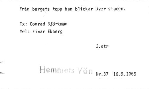 //// Från bergets topp han blickar över staden. //// Tx: Conrad Björkman Mel : Einar Ekberg //// 3.str //// Nr.37 16.9.1965 ////