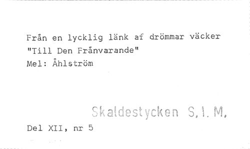 //// Från en lycklig länk af drömmar väcker "Till Den Frånvarande" //// Mel: Åhlström //// Skaldestyc en S, 1. NI, //// Del XII, nr 5 ////
