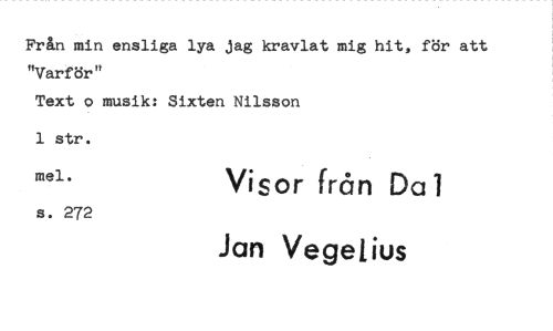 //// Från min ensliga lya jag kravlat mig hit, för att "Varför" //// Text o musik: Sixten Nilsson //// 1 str. //// mel. Visor från Da l //// s. 272 //// Jan Vegelius ////