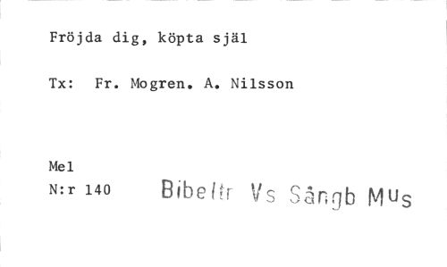 //// Fröjda dig, köpta själ //// Tx: Fr. Mogren. A. Nilsson //// Mel //// N:r 140 Bibeltr Vs Sånjb Mus ////
