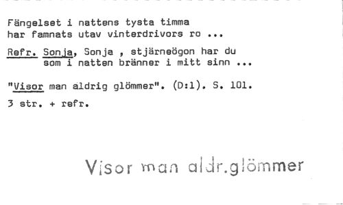 //// Fängelset i nattens tysta timma //// har famnats utav vinterdrivors ro ... //// Refr. Sonja, Sonja , stjärneögon har du som i natten bränner i mitt sinn ... //// "Visor man aldrig glömmer". (D:1). S. 101. 3 str. + refr. //// Visor mun alir. omrner ////