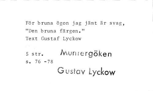 //// För bruna ögon jag jämt är svag, "Den bruna färgen." //// Text Gustaf Lyckow //// 5 str. Mun fergöken //// s. 76 -78 //// Gustav Lyckow ////