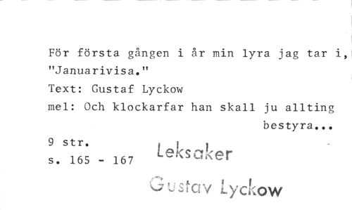 //// För första gången i år min lyra jag tar "Januarivise." //// Text: Gustaf Lyckow //// mel: Och klockarfar han skall ju allting //// bestyra... //// 9 str. //// Leksiiker //// s. 165 - 167 ////