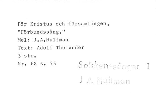 //// För Kristus och församlingen, "Förbundssång." //// Mel: J.A.Hultman //// Text: Adolf Thomander //// 5 str. //// Nr. 68 s. 73 //// e n (7 //// 7 ////
