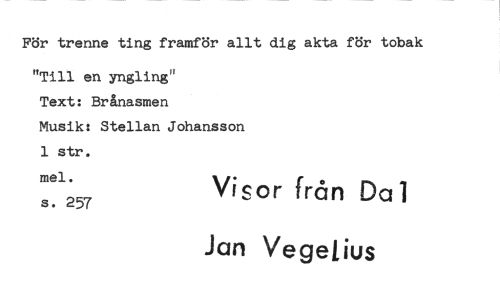 //// För trenne ting framför allt dig akta för tobak //// "Till en yngling' //// Text: Brånasmen //// Musik: Stellan Johansson 1 str. //// mel. //// Visor från Dal //// s. 257 //// Jan VegeLius ////