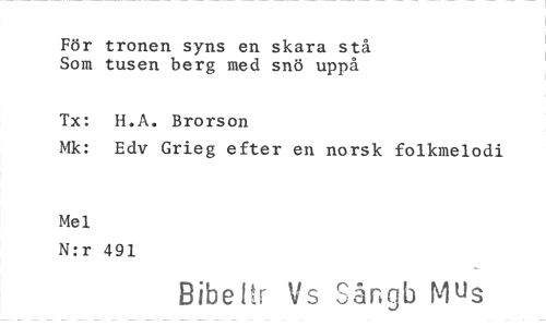 //// För tronen syns en skara stå Som tusen berg med snö uppå //// Tx: H.A. Brorson //// Mk: Edv Grieg efter en norsk folkmelodi //// Mel //// N:r 491 //// Bibeltr ids Sångb Mus ////